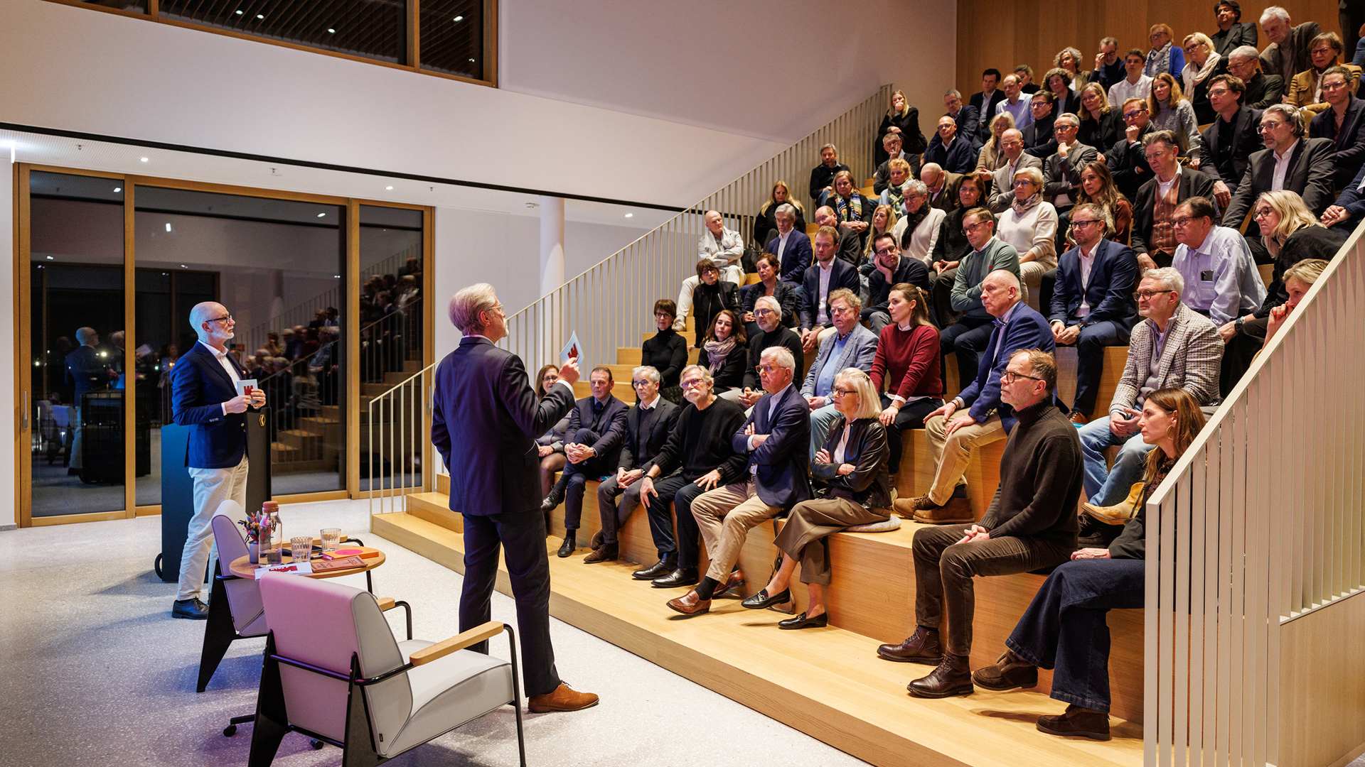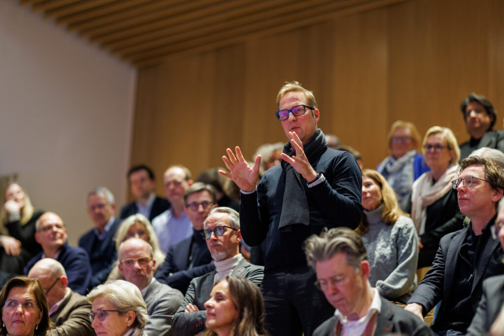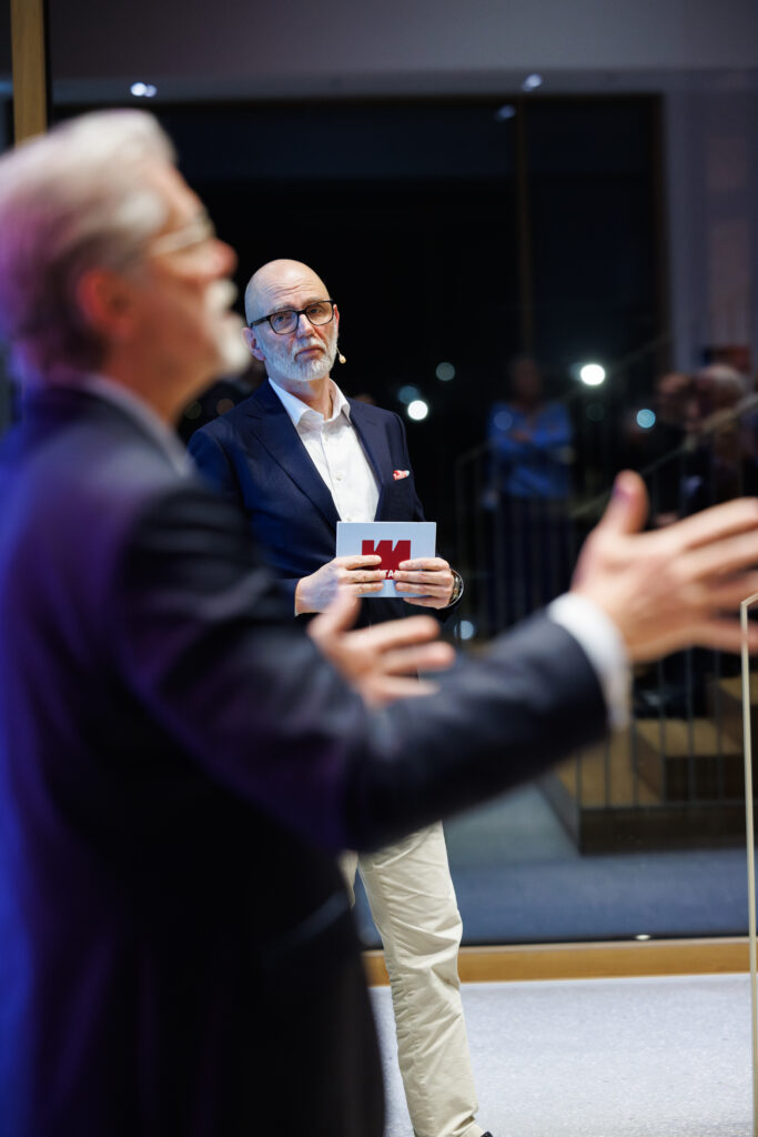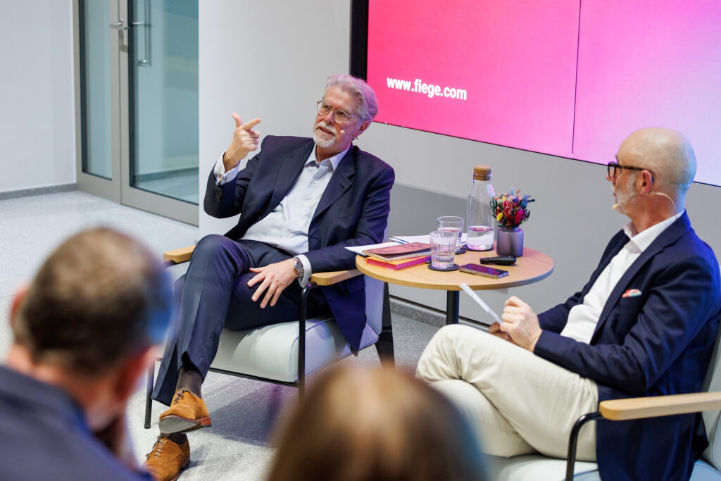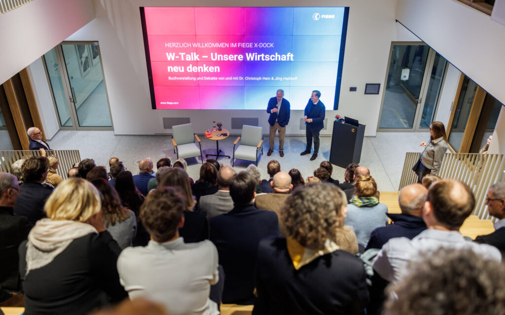 Den Beginn machte ein Gespräch mit Dr. Christoph Hein, F.A.Z., dessen neues Buch Unsere Wirtschaft neu denken zum Ausgangspunkt der Debatte wurde. Gut 80 Gäste aus Wirtschaft, Politik und Institutionen folgten der Einladung zur Premiere im FIEGE X-Dock.